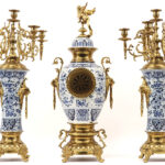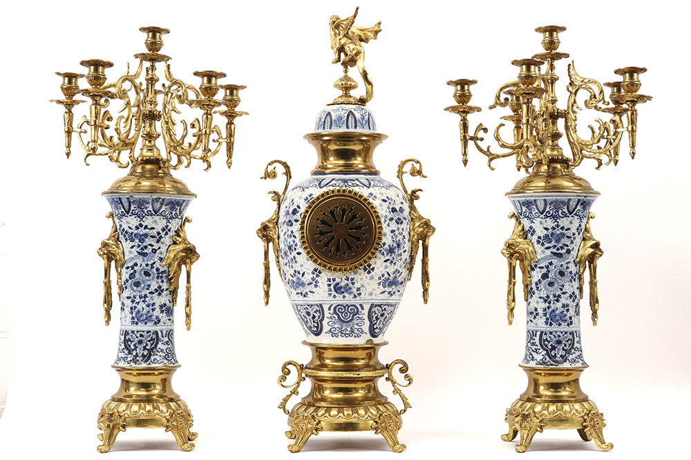 Antieke driedelige schouwgarnituur in koper en Delftse faience met een blauwwit decor, bestaande uit een paar kandelaars en een klok  –  hoogtes : 71 en 74 cm