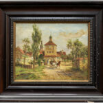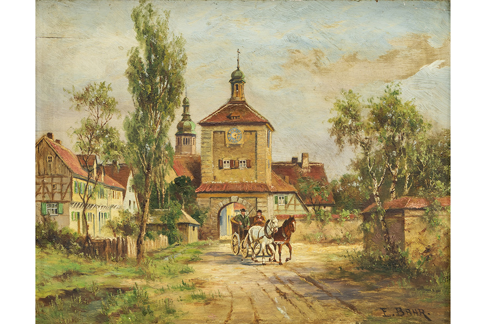 BAHR ERICH (19° – 20° EEUW) twee werken op paneel telkens met een geanimeerd zicht met paarden en een koets bij dorp – 21 x 27 getekend