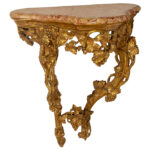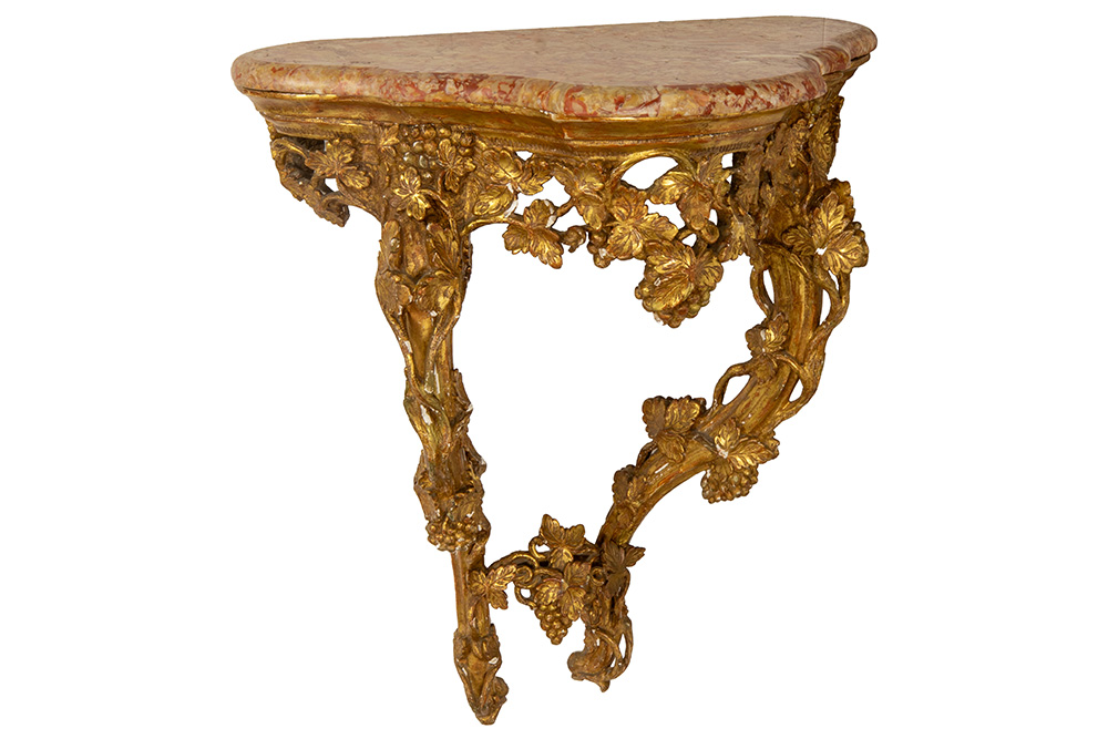 Kleine achttiende eeuwse Franse console in rijke en fijngesculpteerd hout met originele dorure en met typische ornamentiek met bloemen- en druivenranken – met mooi marmeren blad – 68 x 57 x 31 cm