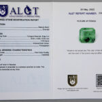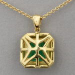 Aantrekkelijke kussenvormige pendatief in geelgoud (18 karaat) met een centrale “intensive vivid green” smaragd uit Colombia van 1,59 karaat, omringd door 0,30 karaat witte ‘E/F/G) kwaliteitsbriljant (VVs/Vs) – met een ketting in geelgoud (18 karaat) met ALGT certificaat voor de smaragd