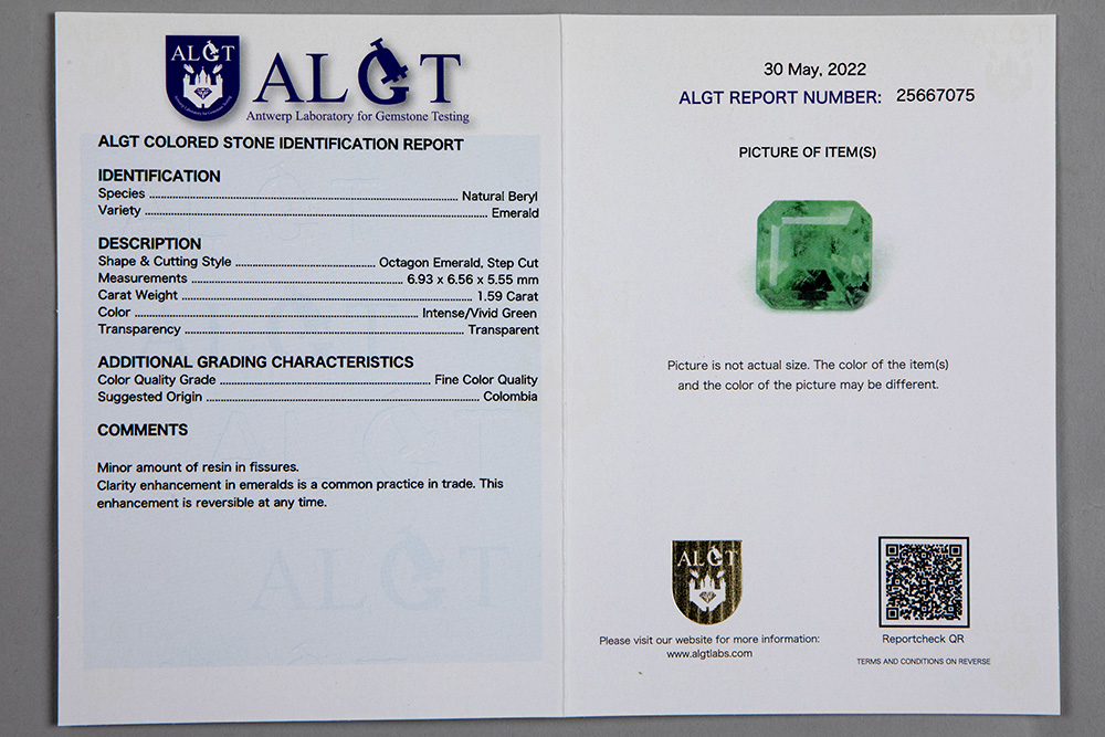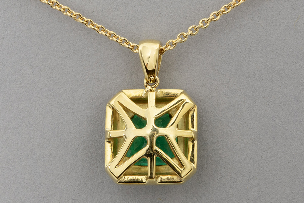 attractive pillow-shaped pendant in yellow gold (18 carat) with a 1,59 carat Colombian “Intensive Vivid green” emerald, surrounded by 0,30 carat of high quality brilliant cut diamonds – on a chain in yellow gold (18 carat) with a “ALGT” certificate for the emerald