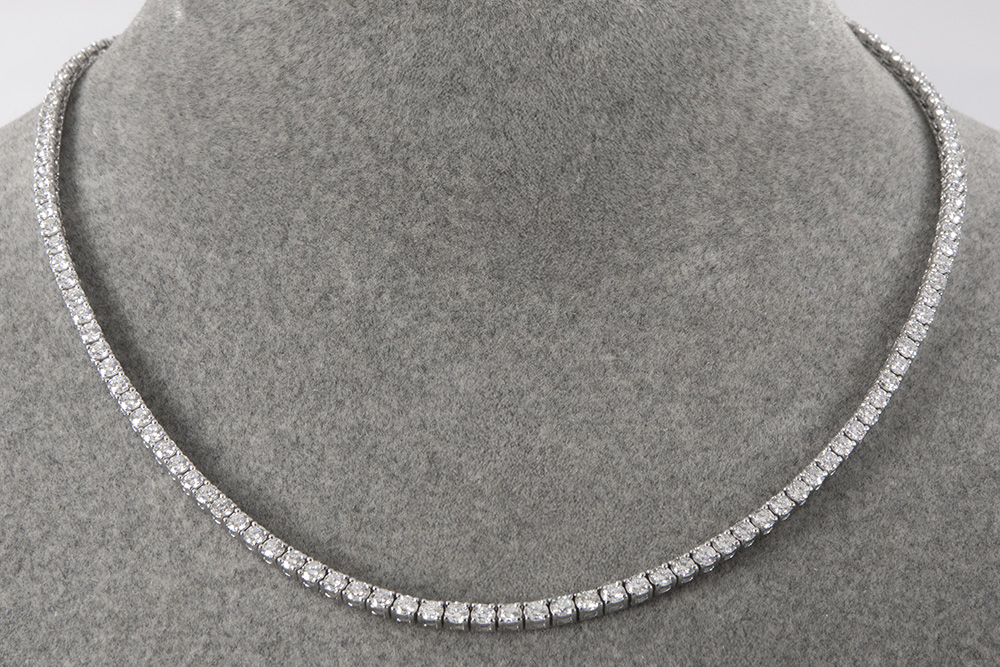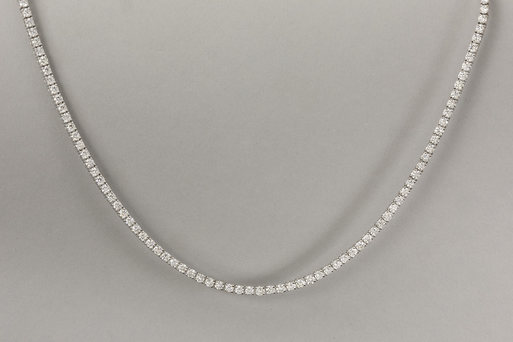 Prachtig collier met zgn rivièremodel in witgoud (18 karaat) bezet met 10,30 karaat blauwwitte (D/E/F) kwaliteitsbriljant (Vvs/Vs) – gewicht : 21,2 gram