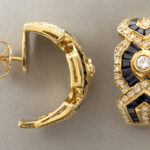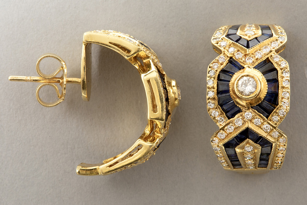 Paar oorbellen van de laten jaren ’80 in geelgoud (18 karaat) bezet met ca 1,80 karaat speciaal geslepen saffieren en ca 0,60 karaat blauwwitte (E/F) kwaliteitsbriljant (Vs/Si) – gewicht : 9,2 gram