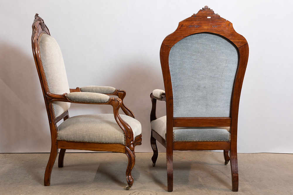 pair of 19th Cent. Napoleon III armchairs in mahogany with sculpted Louis XV style ornaments