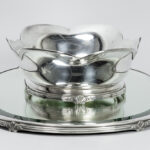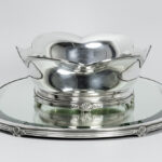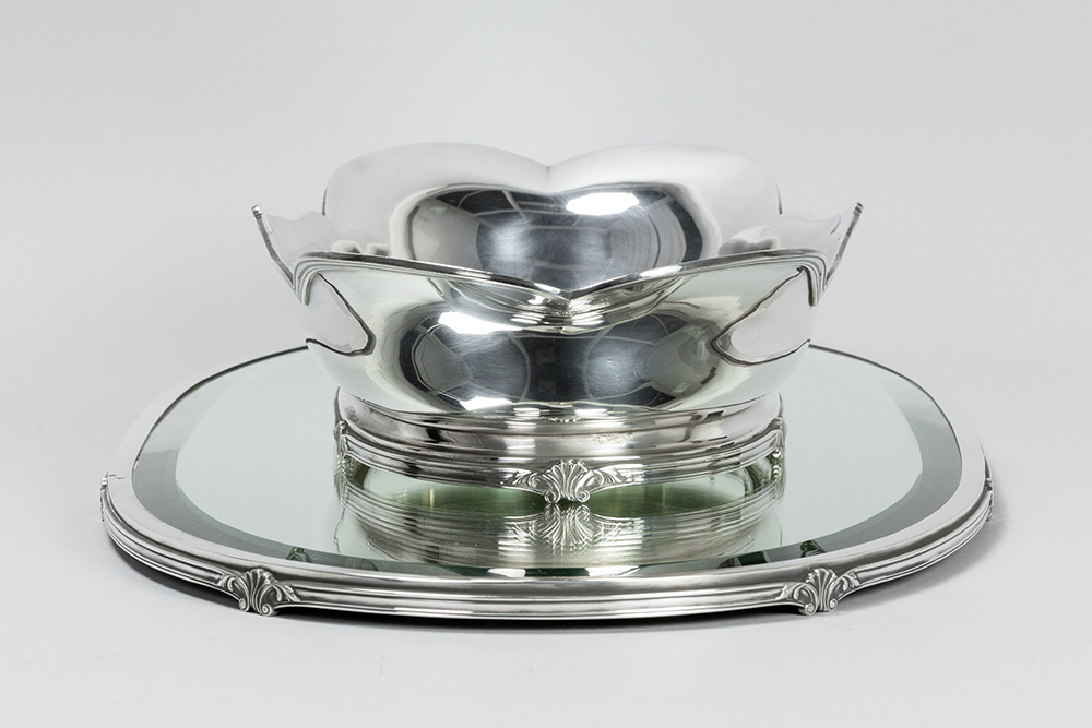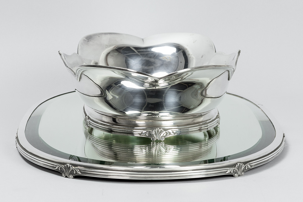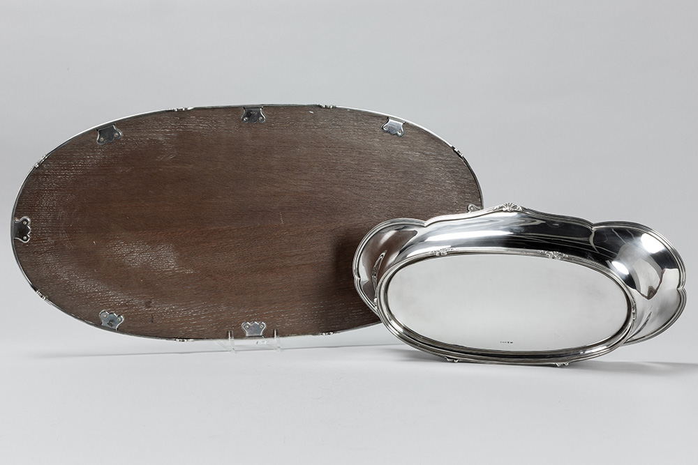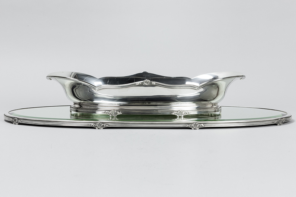 oval Belgian ‘Wolfers’ signed centerpiece set of a jardinier and a tray (with mirror) in 925 marked silver