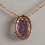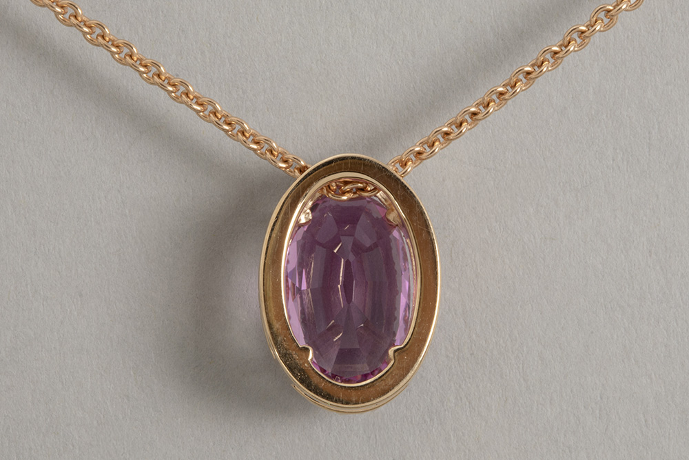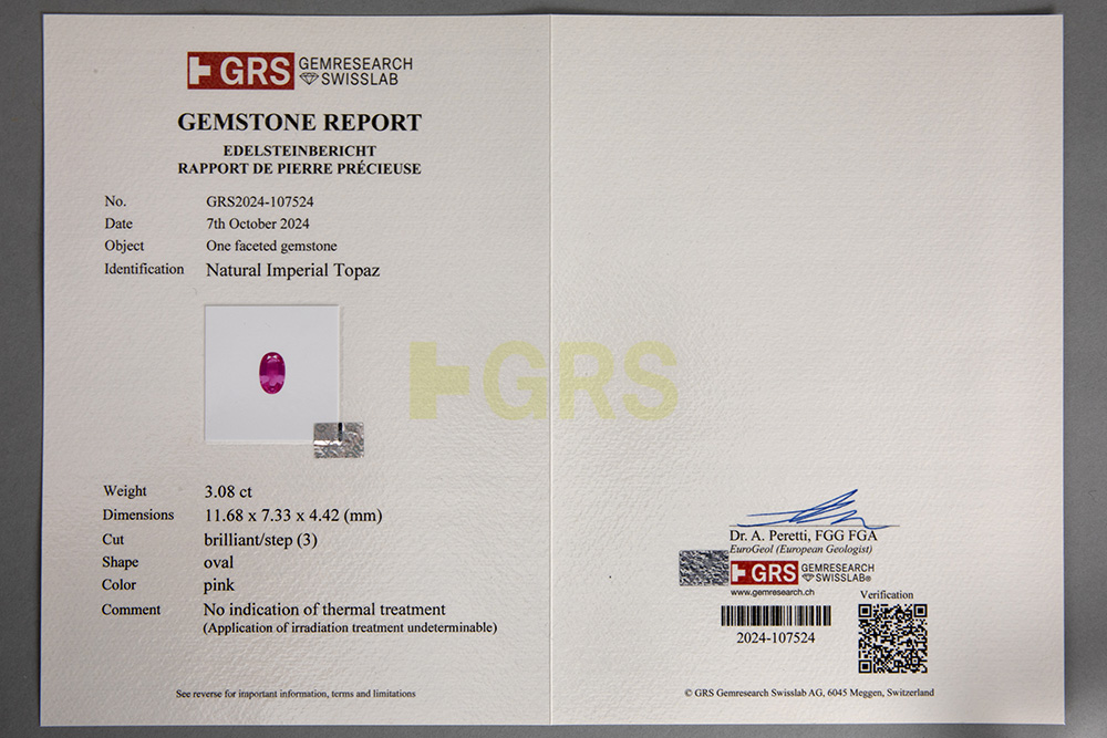 delicate 18-karat rose gold necklace with an oval pendant featuring a very important 3.08 carat “Imperial Topaz” with a brilliant, non-heated pink color, surrounded by approx. 0.30 carats of blue-white (F) brilliant cut (VVS) diamonds with GRS certificate. This rare topaz normally has a market value of €10,000/carat!