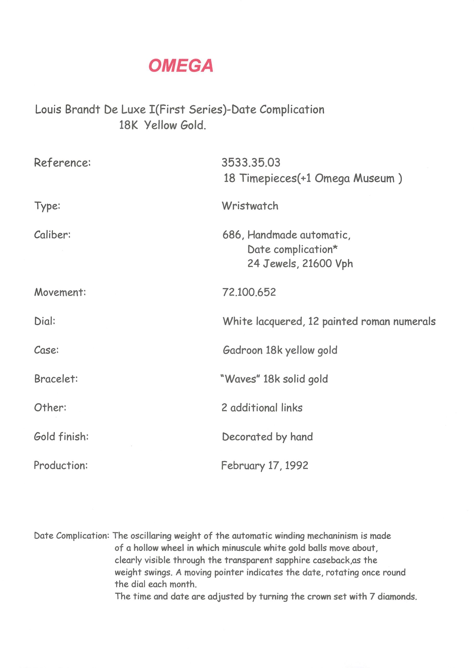 OMEGA – LOUIS BRANDT de LUXE (First Series) zeer zeldzaam volledig origineel handgemaakt automatisch polshorloge (Calibre Omega 686) in geelgoud (18 karaat) met datumcomplicatie en skeletton achterzijde en met originele schakelband (met twee extra schakels) – totaal gewicht : 141 gram – met originele doos, reisdoos, service-factuur & een Omega garantiekaart (05/2027). De “Louis Brandt Collectie” is Omega’s high-end vlaggenschip uit de jaren 1980/90 en werd gelanceerd door de “Special Watches”-afdeling, ter viering van de 90ste verjaardag van het eerste Omega Caliber in 1894. Slechts 18 exemplaren met kaliber 686 werden tussen 1984 en 1992 geproduceerd en voorbehouden aan Omega’s meest loyale klanten.