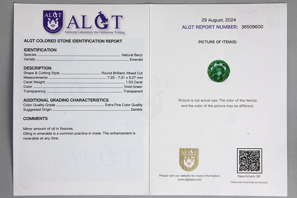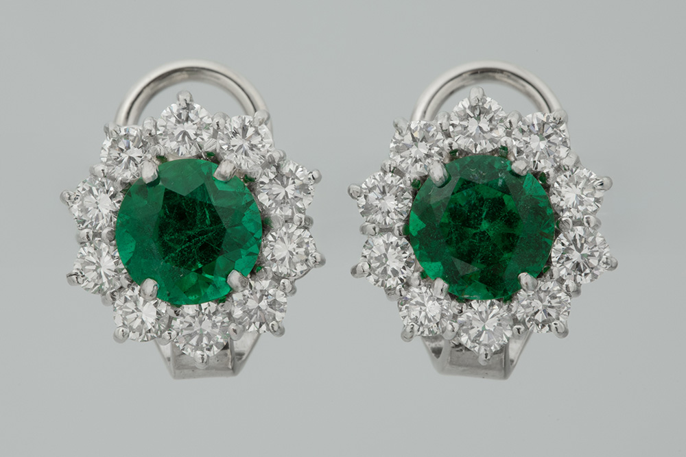 Schitterend paar oorbellen met entouragemodel in witgoud (18 karaat) telkens met een superbe smaragd uit Zambia met superbe “Vivid green” kleur, omringd door briljant – in totaal : 3,17 karaat smaragd en ca 2 karaat blauwwitte (E) kwaliteitsbriljant (Vs) met twee ALGT certificaten Het is eveneens belangrijk dat de twee smaragden dezelfde zgn “jardin” hebben !