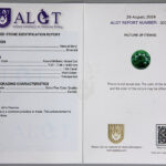 superb pair of earrings in white gold (18 carat) with 3,17 carat of “Vivid green” emeralds from Zambia surrounded by ca 2 carat of very high quality brilliant cut diamonds with two ALGT certificates It is also important and remarkable that the two emeralds have the same “jardin” !