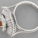 Klassevolle cocktailring in platina met een gegolfd ruitvormig sierstuk centraal bezet met een oranjekleurige saffier van ca 1,30 karaat, omringd door ca 3 karaat blauwwitte (F) kwaliteitsbriljant (Vvs) in klassieke en baguetteslijp