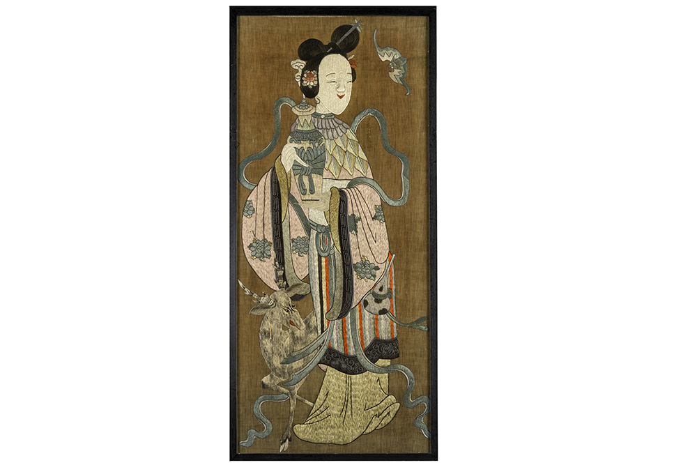 Antiek Chinees ingekaderd stuk textiel met borduurwerk in zijde : “Hofdame met vaas en vleermuis (‘Fu’)” – 110 x 56