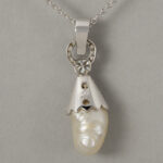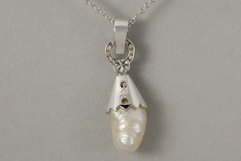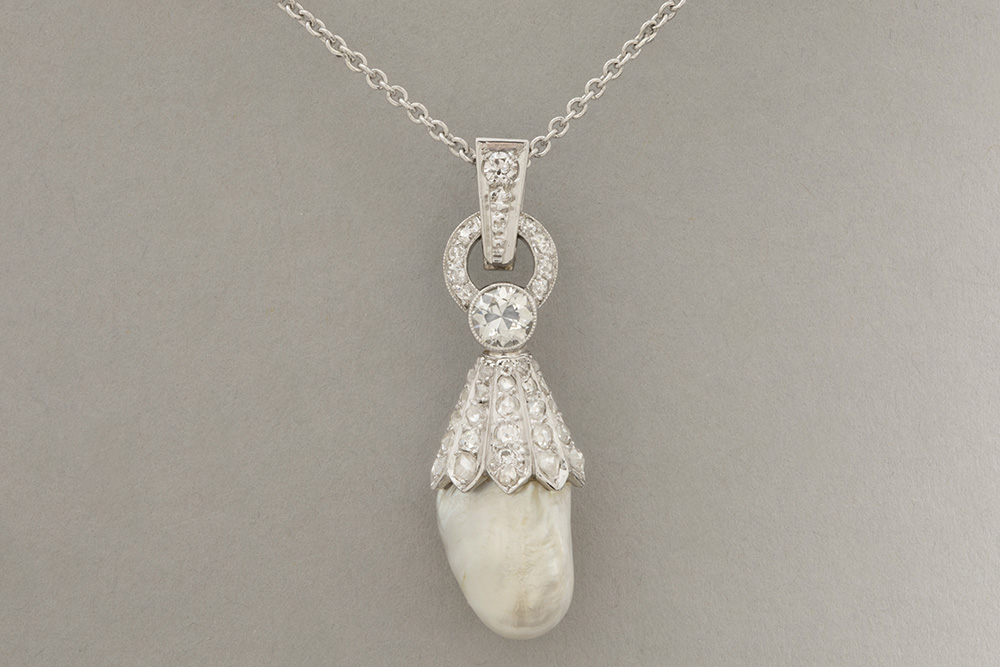 Art Deco-pendant in platinum with a natural baroque pearl and ca 0,70 carat of high quality old brilliant cut diamonds – on a chain in white gold (18 carat) with SSEF certificate