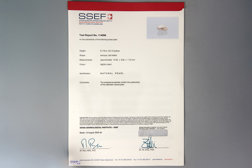 Art Deco-pendatief in platina met een natuurlijke parel met barokke vorm (ca 12,85 x 8,85 x 7,70 mm) en met ca 0,70 karaat witte (G/H) kwaliteitsbriljant (Vs) in de typische slijp van deze periode (ca 1920/25) – met een ketting in witgoud (18 karaat) met SSEF certificaat