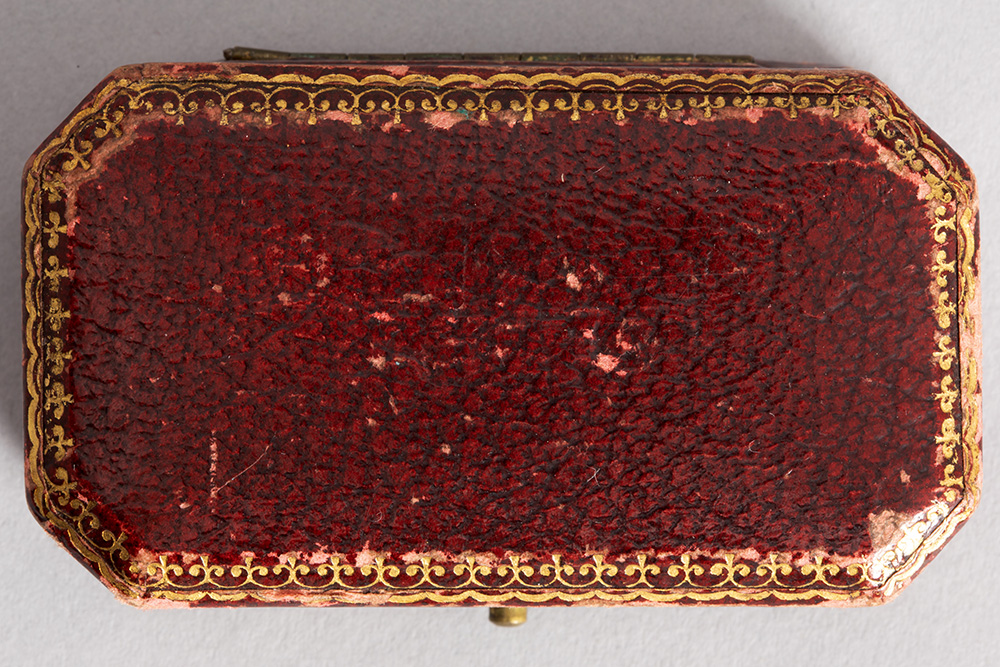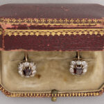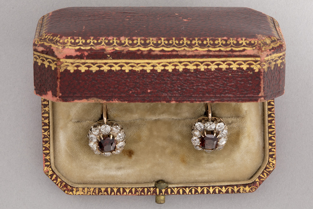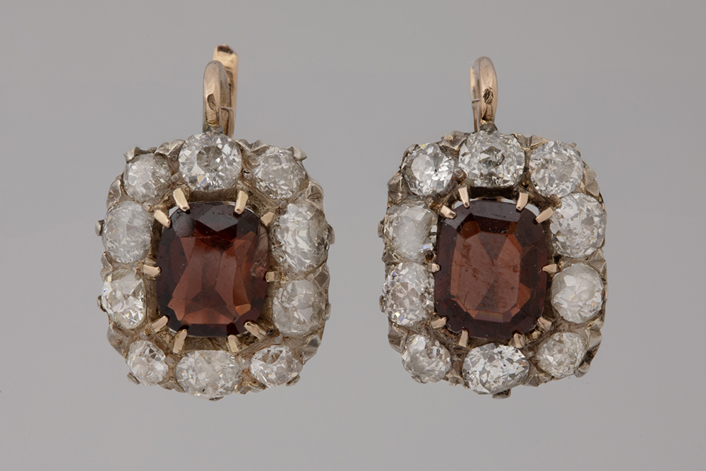 pair of 19th Cent. East-European, presumably Russian earrings in pink gold (18 carat) with ca 2,50 carat of grenade and ca 3 carat of Bolshevik cut diamonds – with its original box