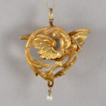 Mooie Art Nouveau-pendatief in geelgoud (18 karaat) en in de vorm van een gevleugelde draak bezet met een pareltje en diamant – gewicht : 3,2 gram – ca 1900