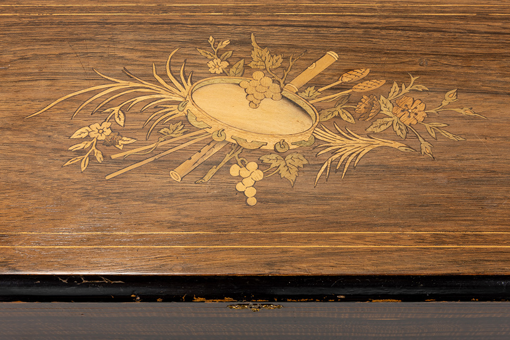 19th Cent. Napoleon III style musical box in rose-wood with inlay and with 6 melodies