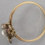 ring in yellow gold (18 carat) with an antique Art Nouveau Insect with a small pearl, two red eyes (ruby ?), diamond and an old brilliant cut diamond