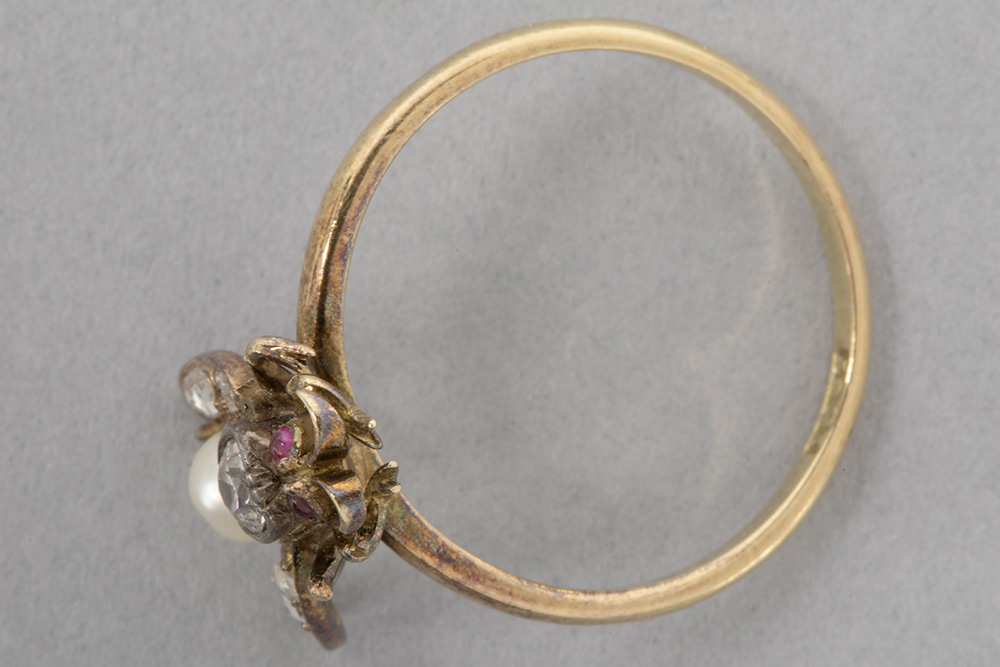 Ring in geelgoud (18 karaat) met een antiek Art Nouveau-sierstuk in de vorm van een insect, bezet met een pareltje, diamant, kwaliteitsbriljant in oude slijp en twee oogjes allicht van robijn