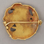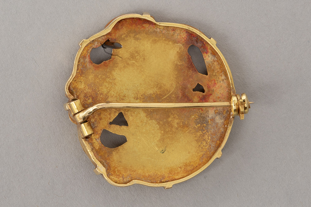 antique Art Nouveau brooch in yellow gold (18 carat) with a bas relief with a women’s bust in whiplash style & with rose cut diamonds