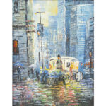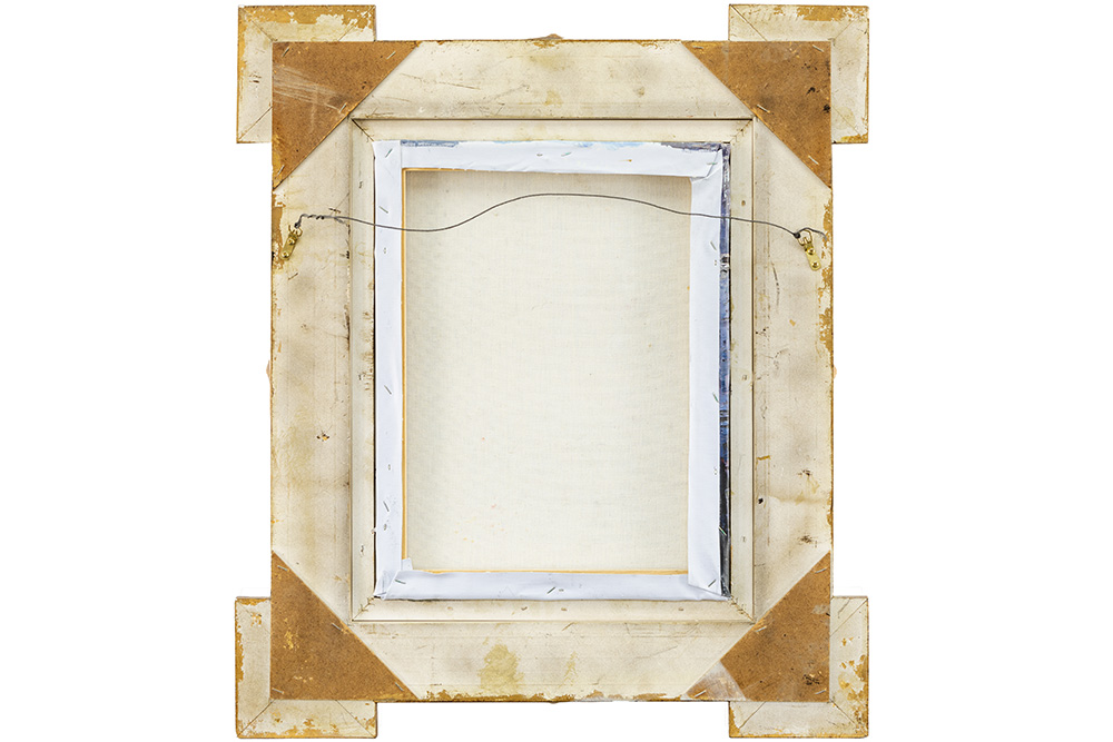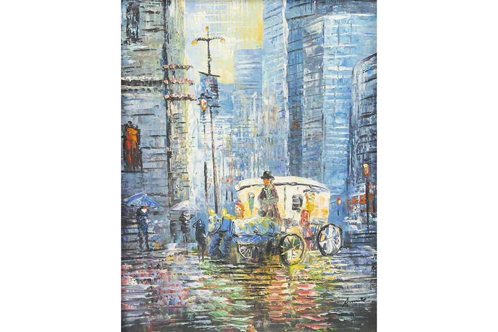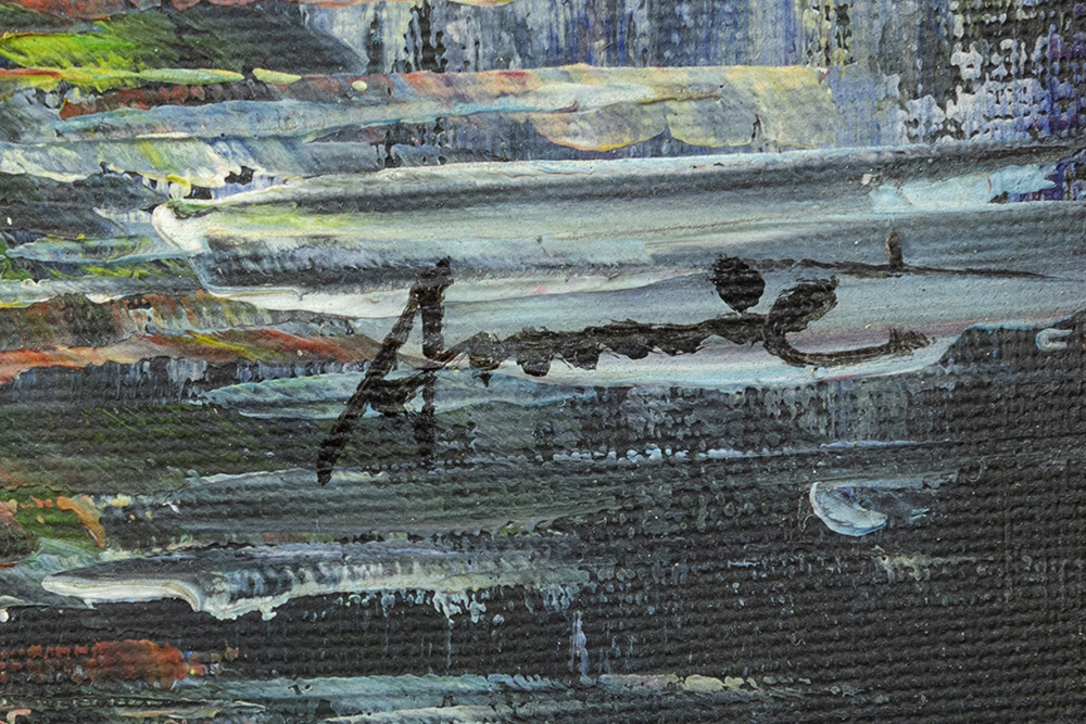 Onleesbaar getekend olieverfschilderij op doek met stadszicht – 46 x 36