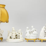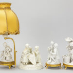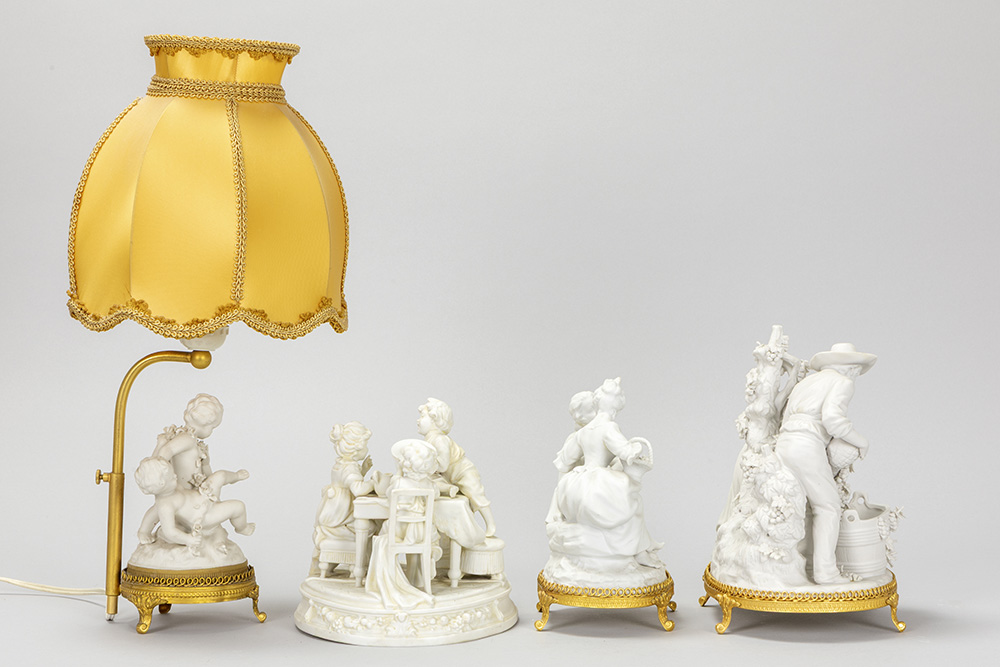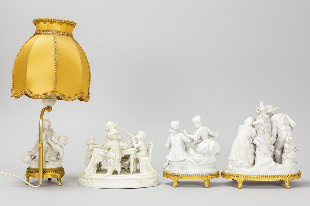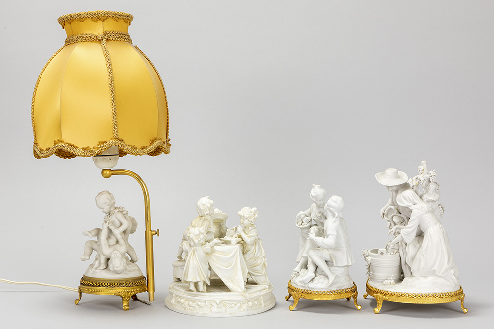 Lot (4) bibelots in biscuit waaronder een schemerlampje