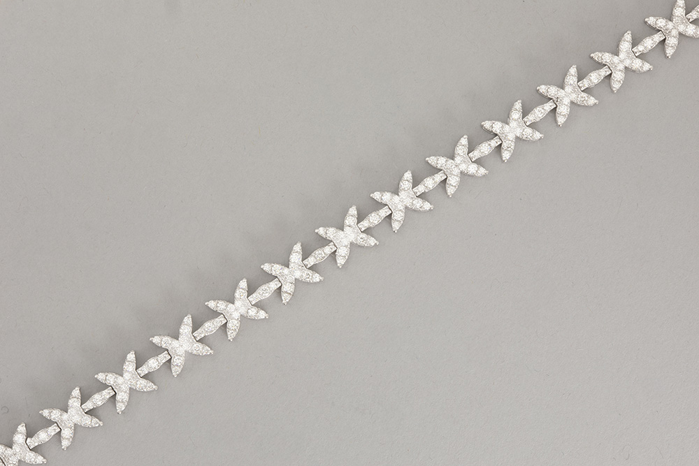 Fraai bracelet met een sierlijk model met stermotieven in de stijl van Tiffany in witgoud (18 karaat) en bezet met zeker 3,30 karaat witte (E/F/G) kwaliteitsbriljant (Vvs/Vs) – gewicht : 15,6 gram