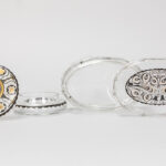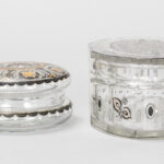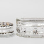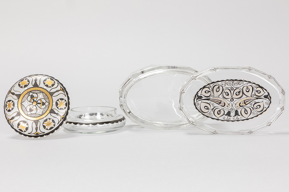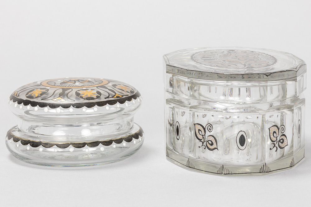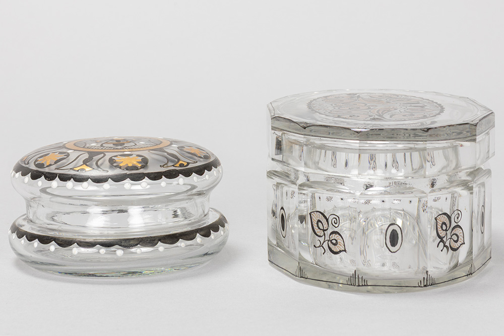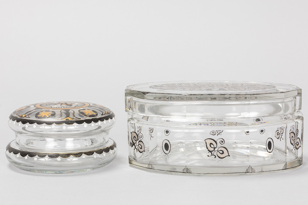 two exquisite Adolf Beckert for Steinschönau pieces in clear crystal, richly decorated by hand with gilt and black enamels, a jewellery box and pill box – to be dated around 1916