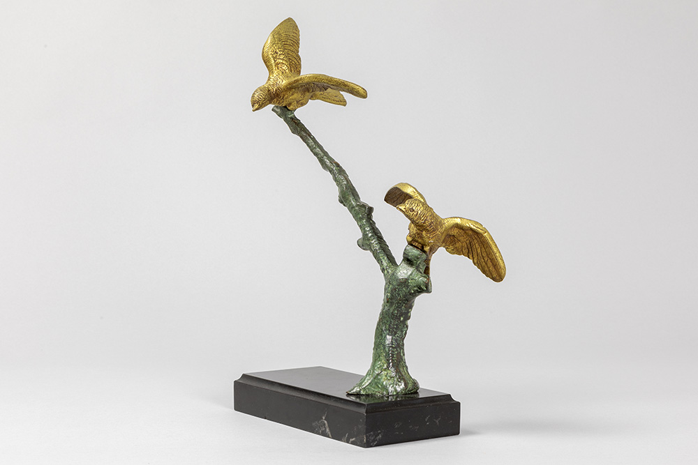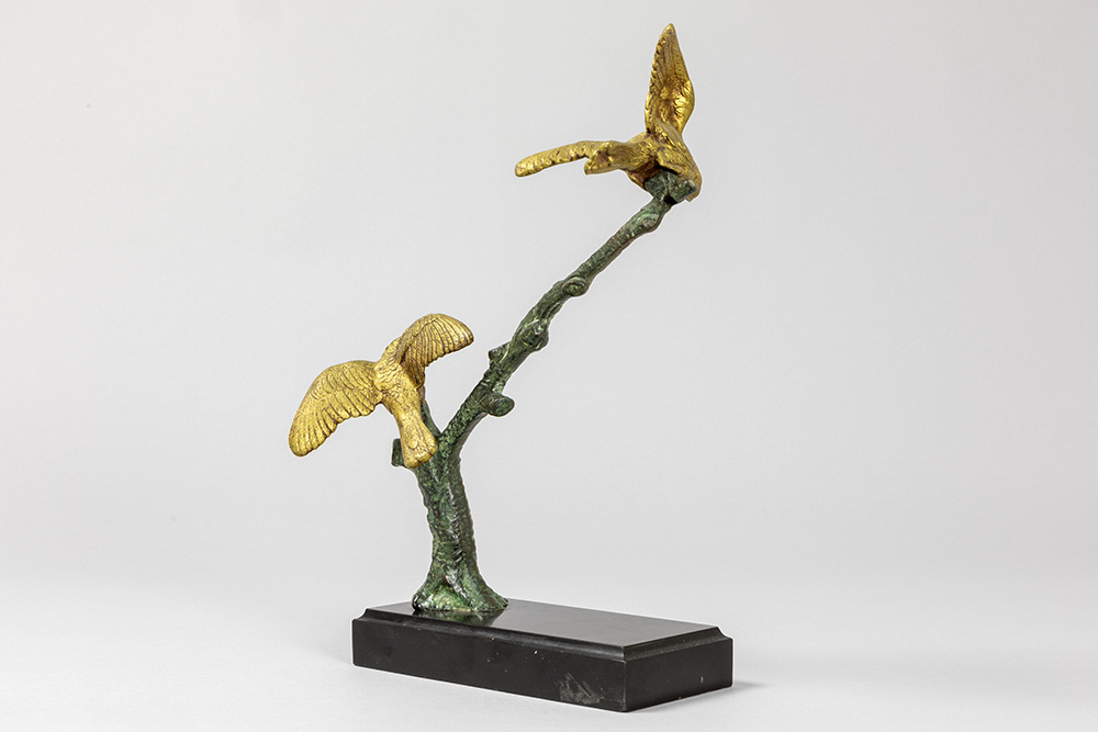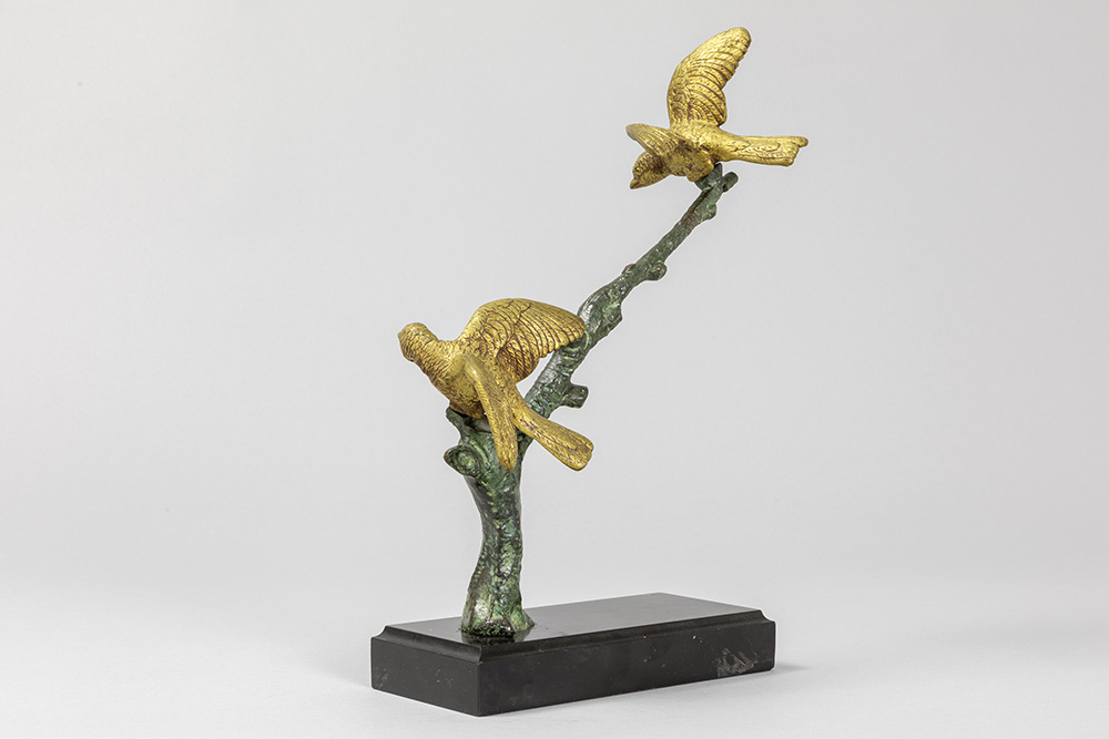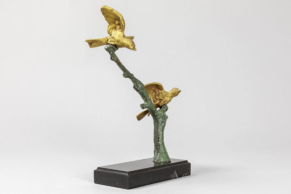 Art Deco-sculptuur in brons met groene en goudpatine : “Twee vogels op tak” – op zwarte marmeren basis – hoogte en breedte : 33 en 22 cm – ca 1930