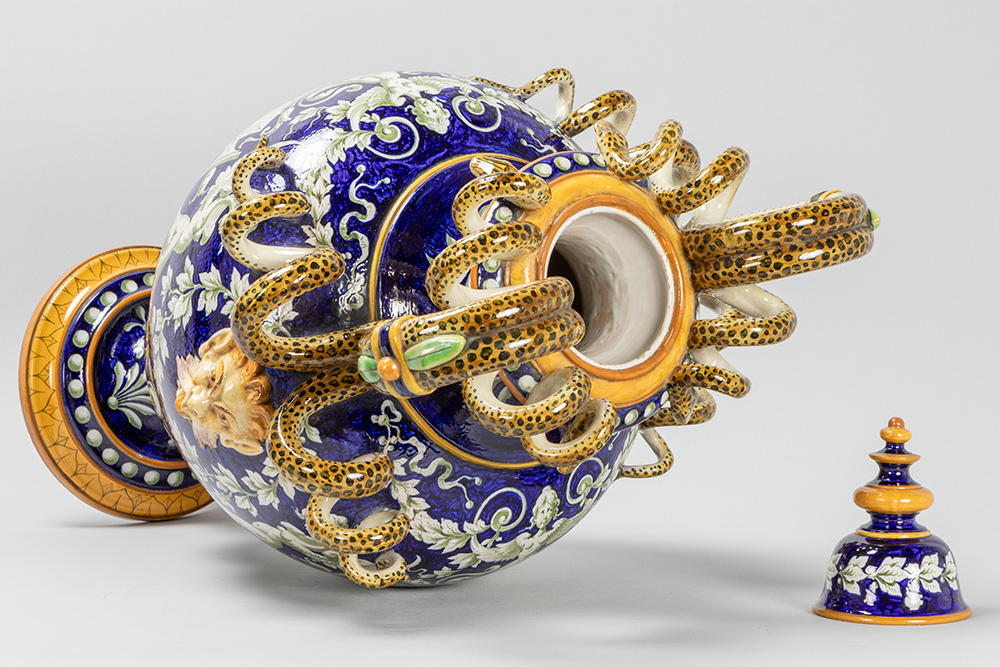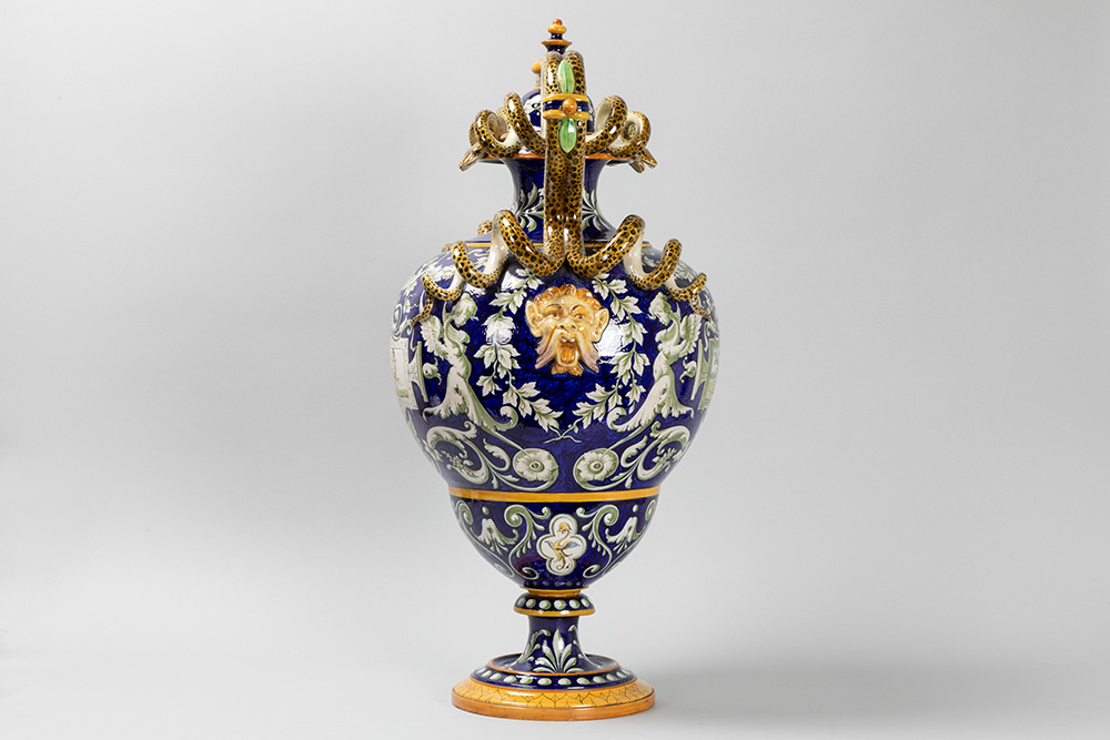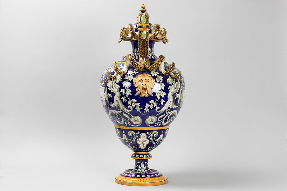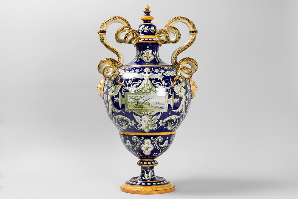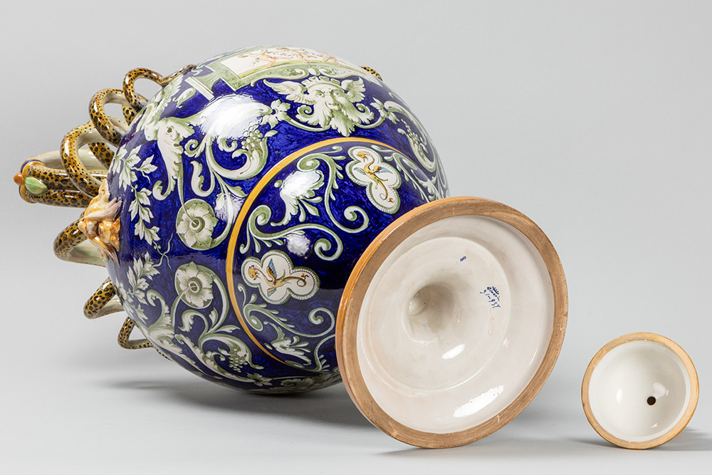 GINORI – te dateren ca 1870/1900 vaas in faience van Capo di Monte met een design en decor in Renaissancestijl met twee slangvormige grepen en typische beschilderingen – hoogte : 71 cm