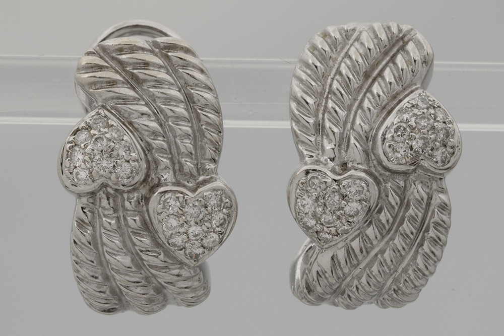 Paar oorbellen in witgoud (18 karaat), telkens met een hartvorm, bezet met briljant, en drie banden – in totaal : ca 0,40 karaat kwaliteitsbriljant (E/F/G – Vs/Si) – gewicht : 16,6 gram