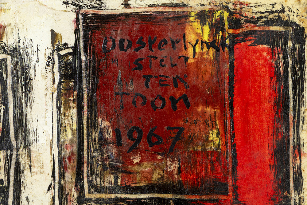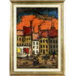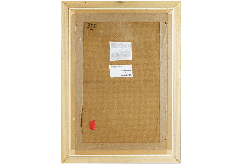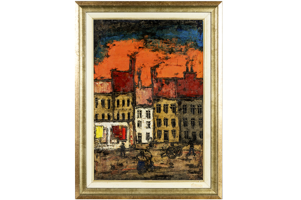 OOSTERLYNCK JEAN ÉMILE (1915 – 1995) olieverfschilderij op paneel met een stadszicht en verwijzing in het werk “Oosterlynck stelt tentoon” – 55 x 37 getekend en gedateerd 1967