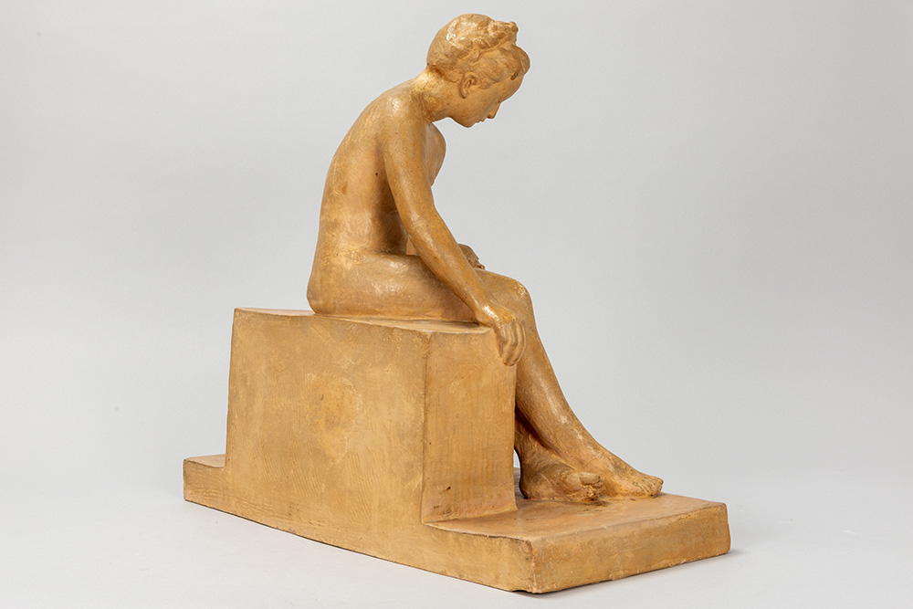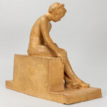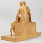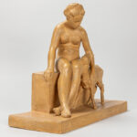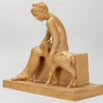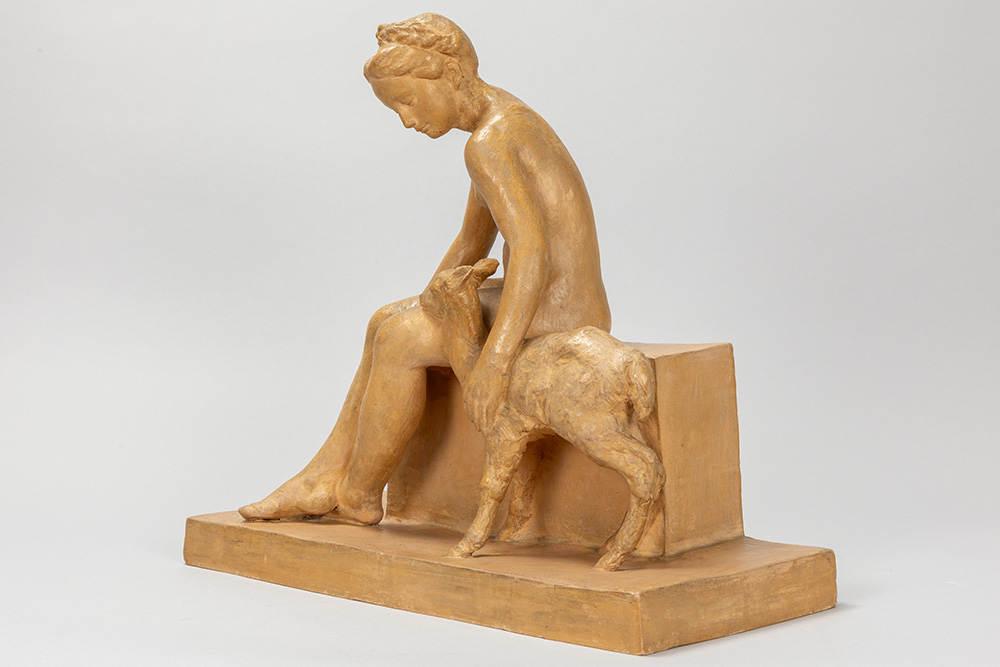 COCRY Art Deco-sculptuur in terracotta : “Zittend meisje met hert” – hoogte en breedte : 45 en 50 cm getekend