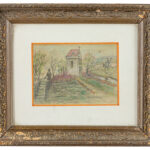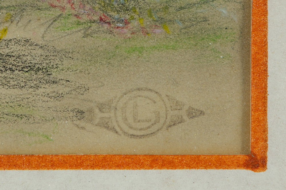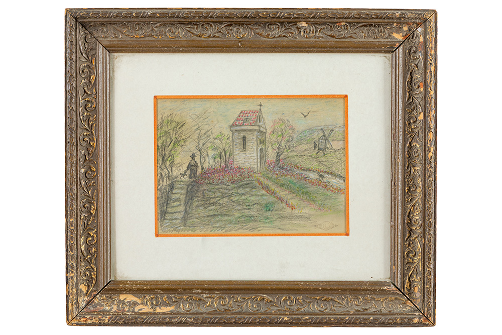 LEMMEN GEORGES (1865 – 1916) kleurpotlood tekening : “Wandelaar bij kapelletje” – 14,5 x 20,5 met atelierstempel