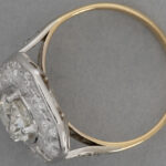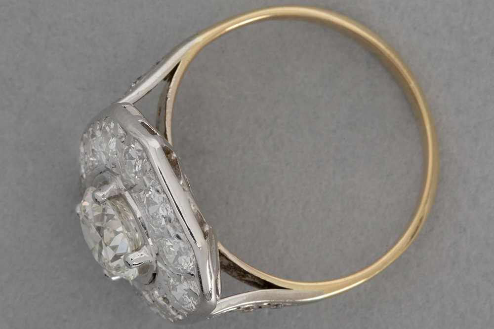 Late Art Deco-ring in geel en grijs goud (18 karaat) met octogonaal sierstuk, bezet met een centrale grotere kwaliteitsbriljant (I – Vs) van 0,98 karaat, omringd door ca 1,10 karaat witte (G) kwaliteitsbriljant (Vs)