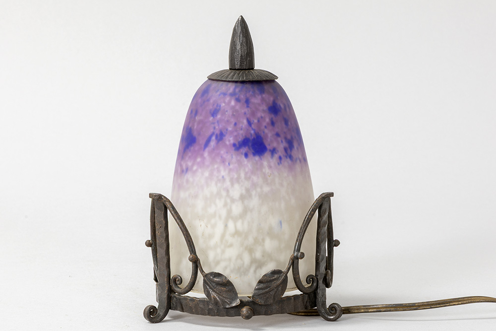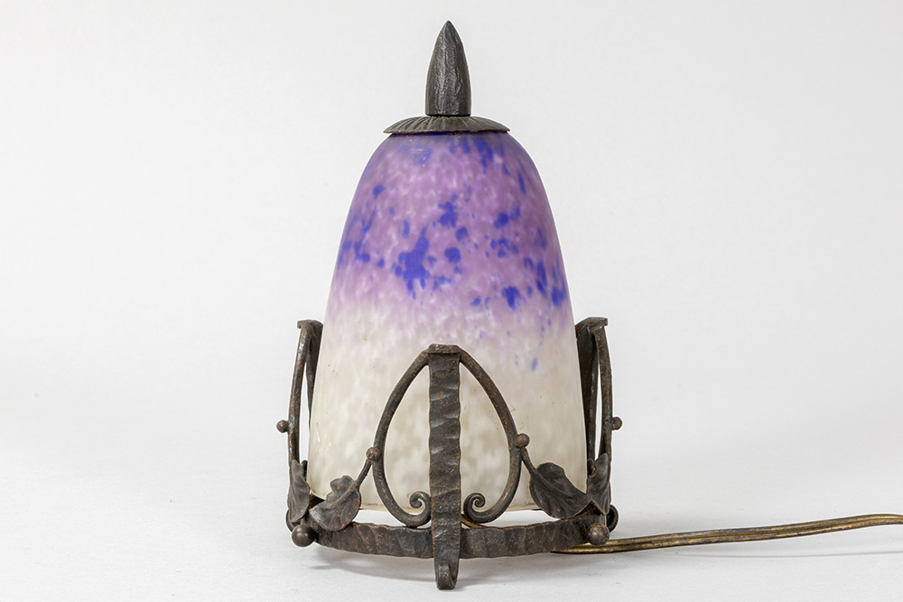 SCHNEIDER vroeg Art Deco-nachtlampje – zgn veilleuse – met fraaie montuur in smeedijzer en met kap in gemarmerde glaspasta – hoogte : 19 cm – ca 1920 getekend