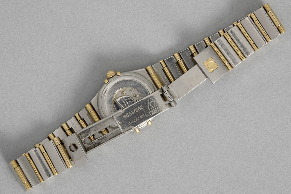 completely original Omega marked quartz “Constellation” ladies’ wristwatch in steel and gold with a mother of pearl face – with some spare links