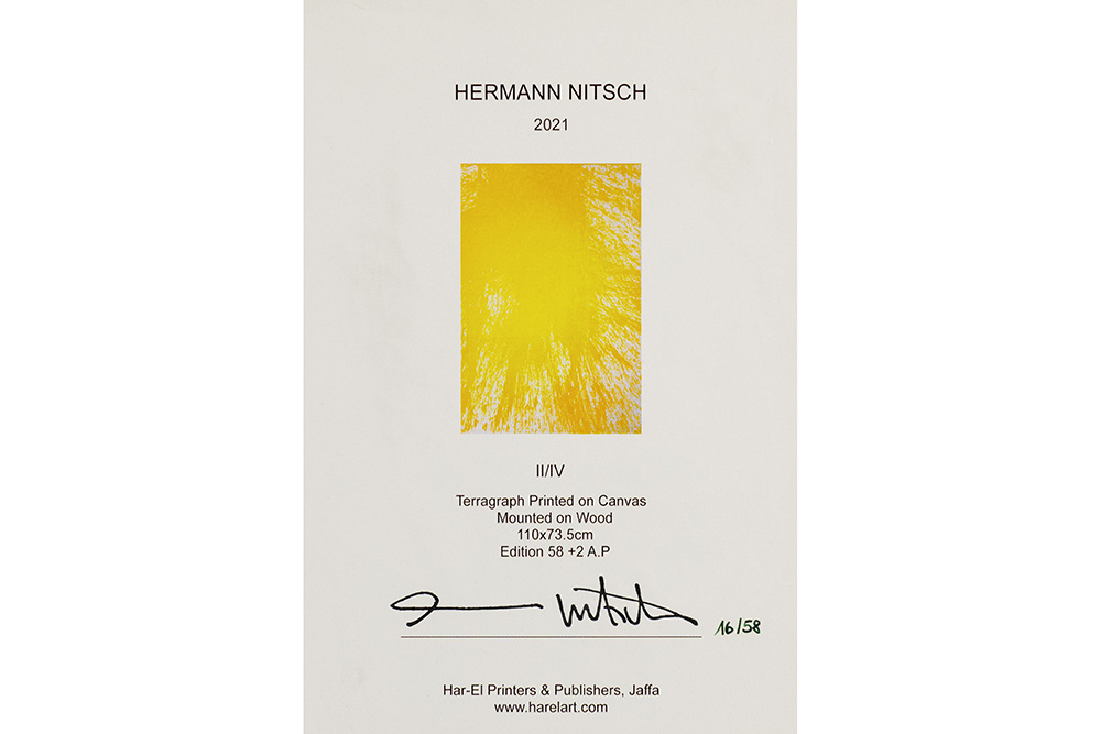 Herman Nitsch terragraph print in colors on canvas, mounted on panel “Station 2” to be dated in 2021 signed on the certificate on the back