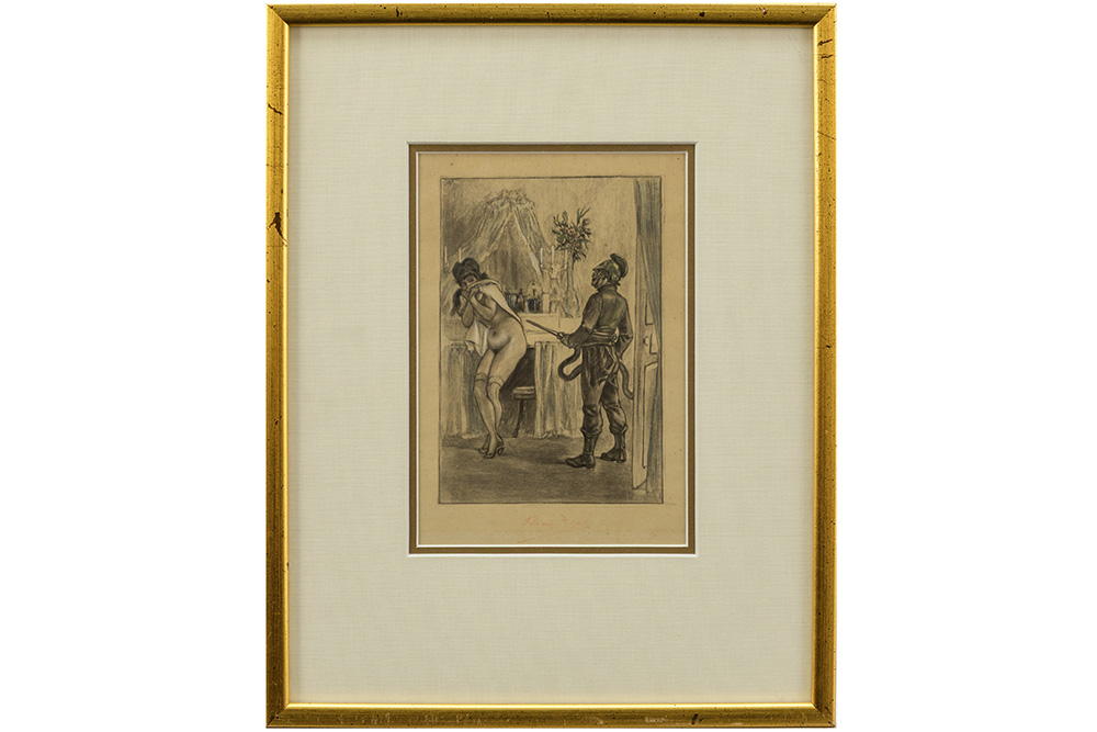 Felicien Rops signed and handraised etching depicting a soldier with a female nude