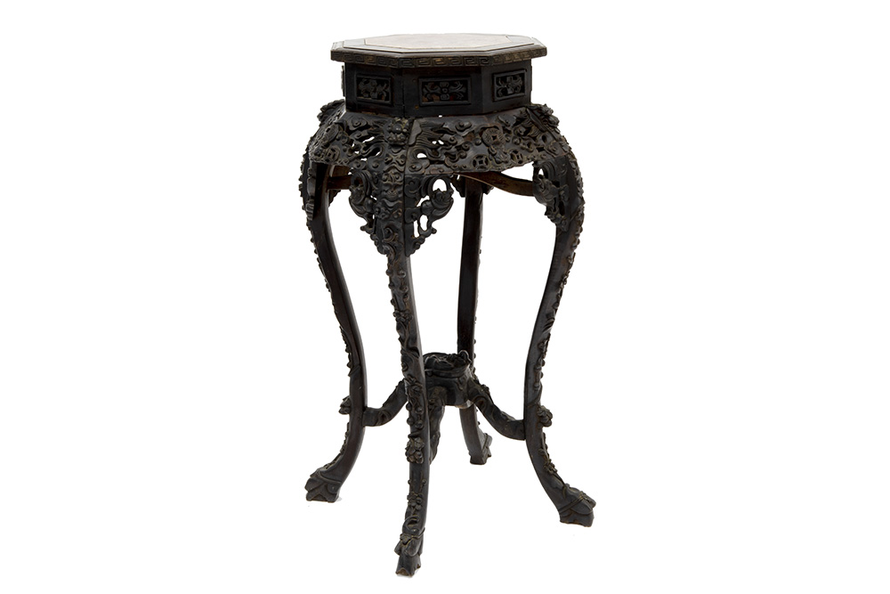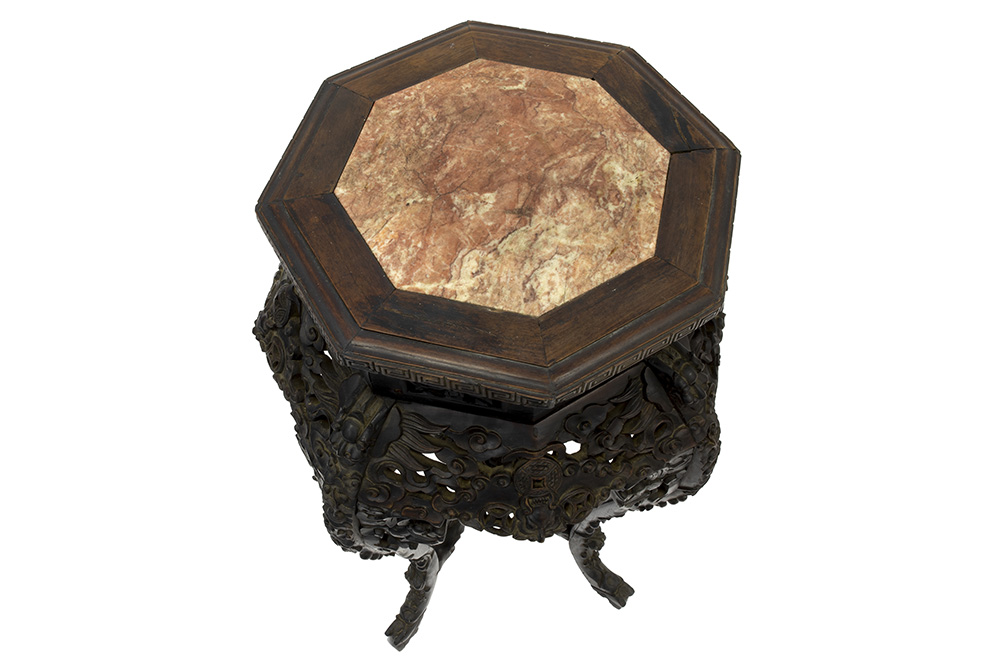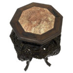 Antieke Chinese piedestalle/bijzettafel in fijn gesculpteerd hout met blad met een ingewerkt stuk marmer – hoogte : 90 cm prov : uit een oude Belgische collectie