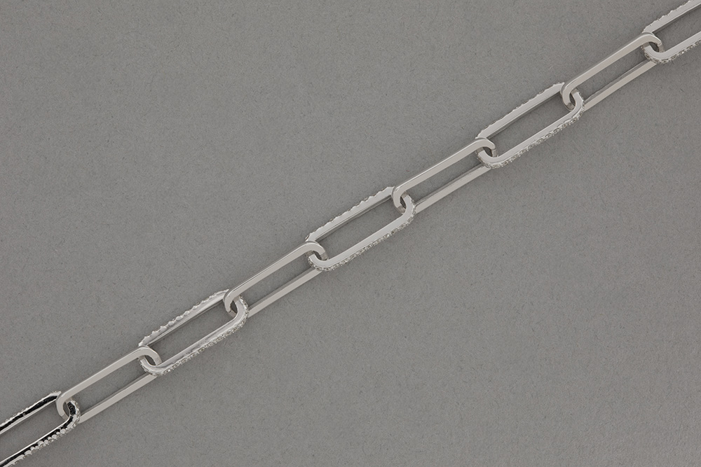 Fijn bracelet beugelvormige schakels in witgoud (18 karaat), afwisselend met of zonder briljant bezet – in totaal : zeker 1,10 karaat blauwwitte (E/F) kwaliteitsbriljant (Vvs/Vs) – gewicht : 7 gram