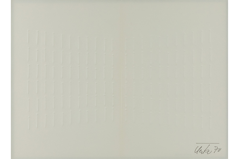 UECKER GÜNTHER (1930 – 2025) zgn “Prägedruck” dd 1970 met de vouw zoals die er was bij de uitgave – 28,5 x 38,5 getekend en gedateerd 1970