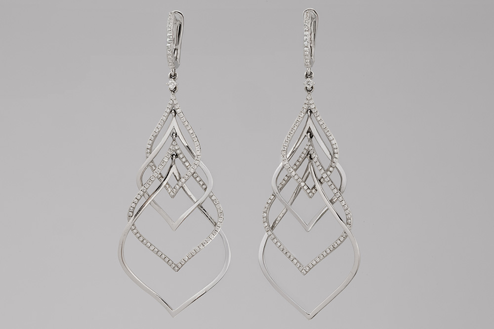 pair of contemporary earrings in white gold (18 carat) with ca 1 carat of brilliant cut diamonds