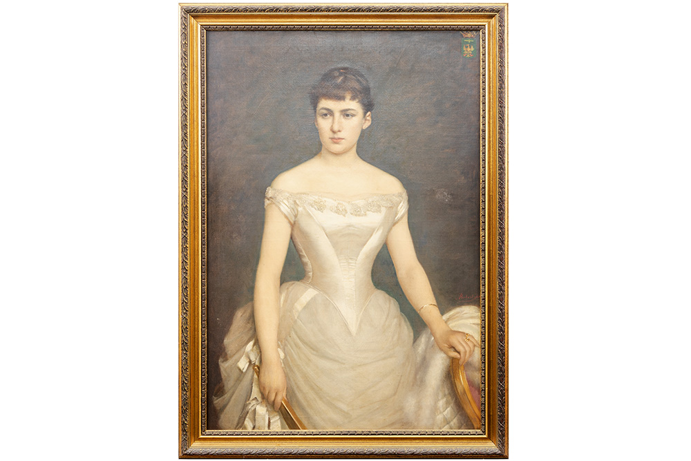 19th Cent. oil on canvas with the portrait of Louise de Preud’homme d’Hailly de Nieuport and with in the upper right corner the coat of arms of the Van Haan family signed Alexandre Robert and dated 1881 (?) prov : court-ordered sale of the contents of Boezinge Castle