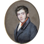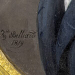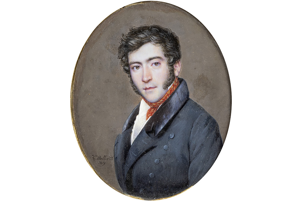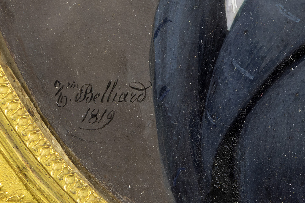 BELLIARD ZÉPHIRIN (1798 – 1861) vroeg negentiende eeuwse ovale miniatuur met het portret van een jonge man – 10 x 8 – in fraaie ovale kader in gedoreerde brons, gezet in een palissander paneeltje getekend en gedateerd 1819