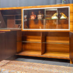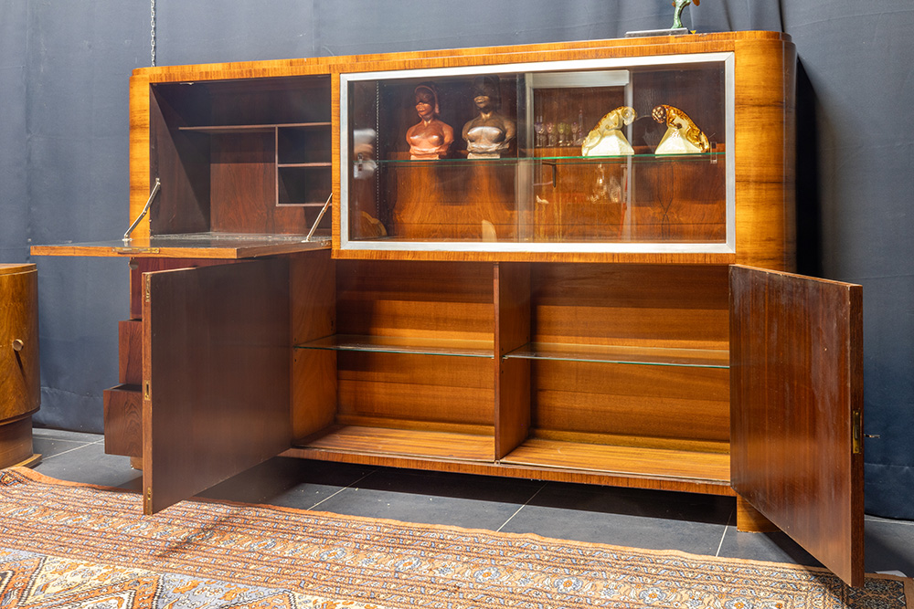 Mooi Art Deco-meubel in palissander en fonteinehout met bar, vitrine en drie laden en twee deuren – ca 1925/30 – 140 x 228 x 38 cm