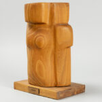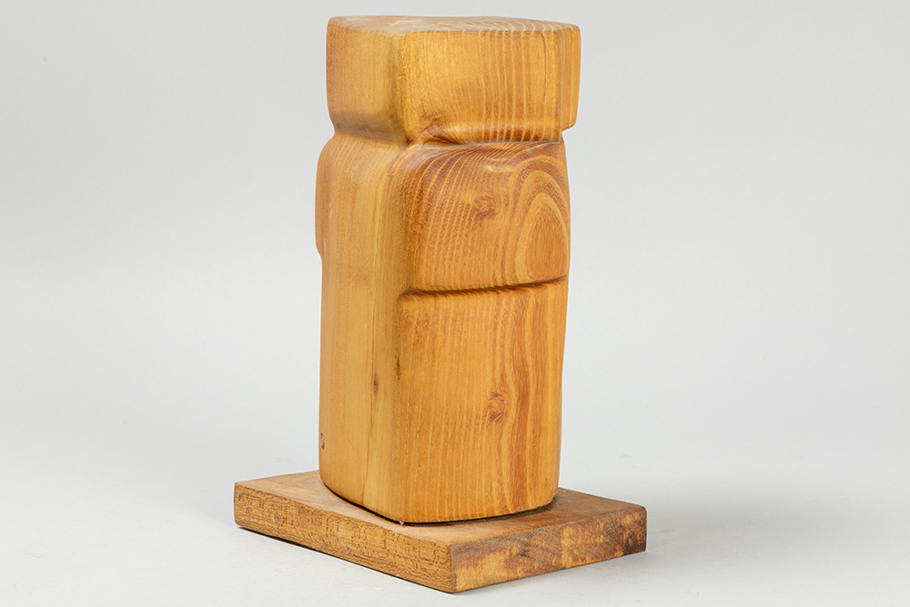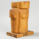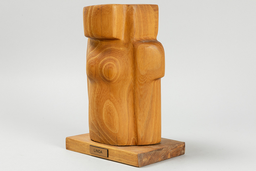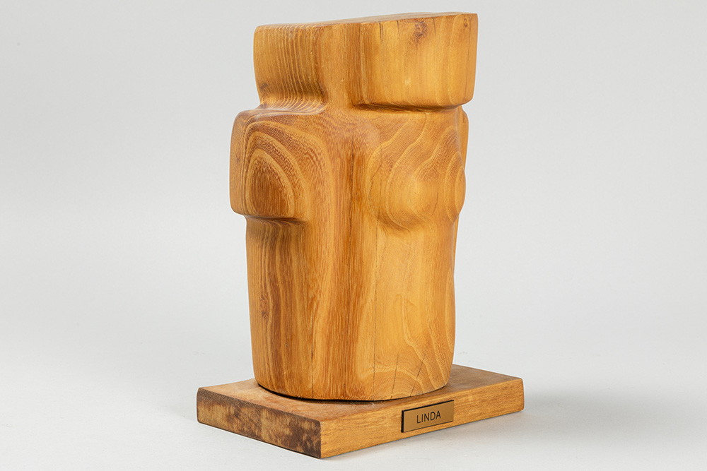 VAN DEN BOSCH JEF (° 1942) sculptuur in hout : “Linda, rondborstig …” – hoogte : 26,5 cm gemonogrammeerd en gededicaceerd aan Jonckers en Co