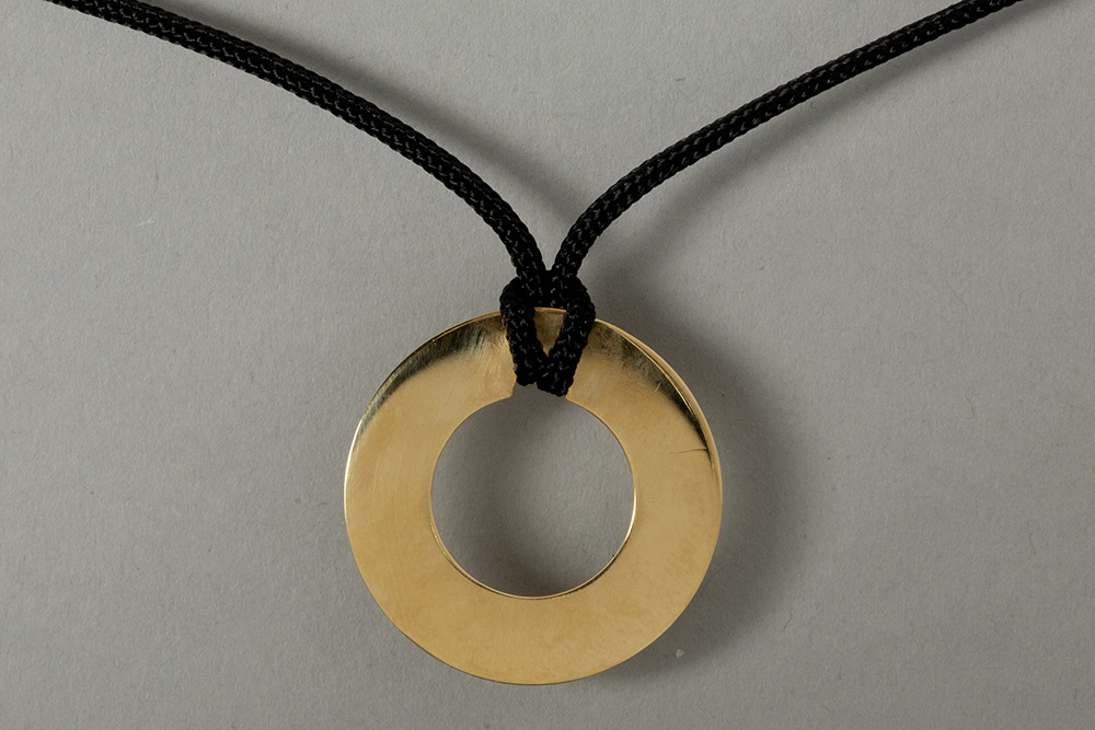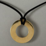 DINH VAN karakteristieke ronde “Bi” – pendatief (ca 2,3 gram) in geelgoud (18 karaat) met zwart koordje gemerkt en getekend