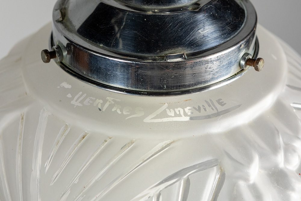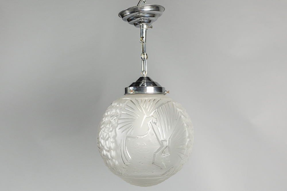 MÜLLER frêres LUNEVILLE Art Deco-halluster met bolle kap in gesatineerd kristalglas met typisch vogeldecor – hoogte : ca 45 cm – ca 1920/30 getekend