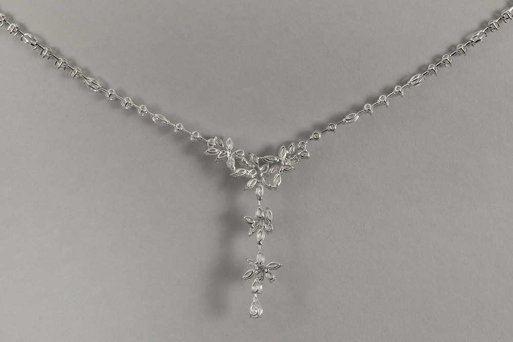 Zeer sierlijk collier in witgoud (18 karaat) met een design met bloemenguirlande en bezet met 8,10 karaat blauwwitte (D) CVD kwaliteitsbriljant (Vvs) in marquise- en klassieke slijp – gewicht : 20,15 gram