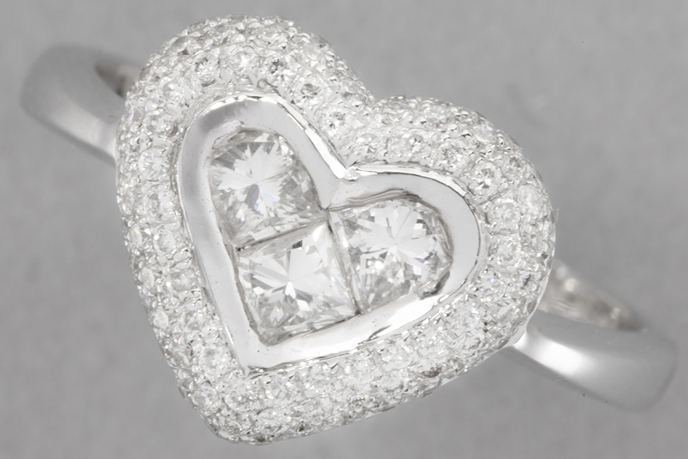 ring in white gold (18 carat) with a heart shaped center and with ca 1 carat of quality carré and brilliant cut diamonds